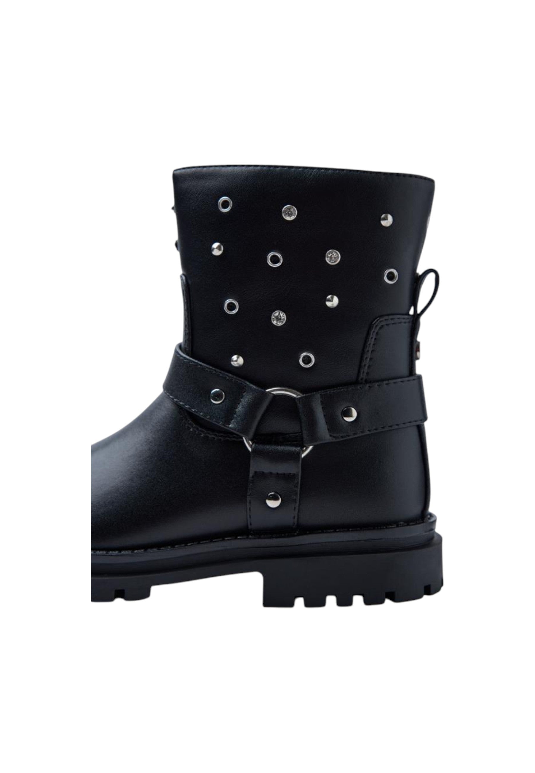 Questi stivali soft-touch con borchie, occhielli e strass sono caratterizzati da tomaia in poliuretano e fodera in poliuretano e nylon, soletta in poliuretano imbottata, è prevista chiusura con cerniera laterale, suola in gomma.