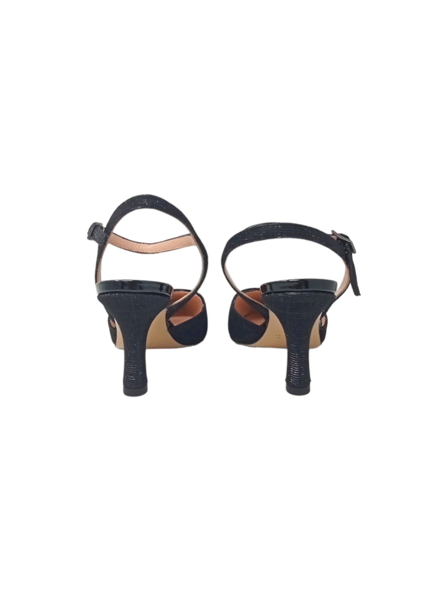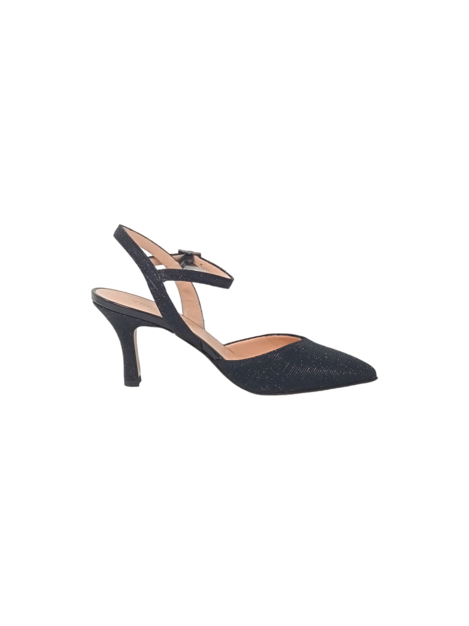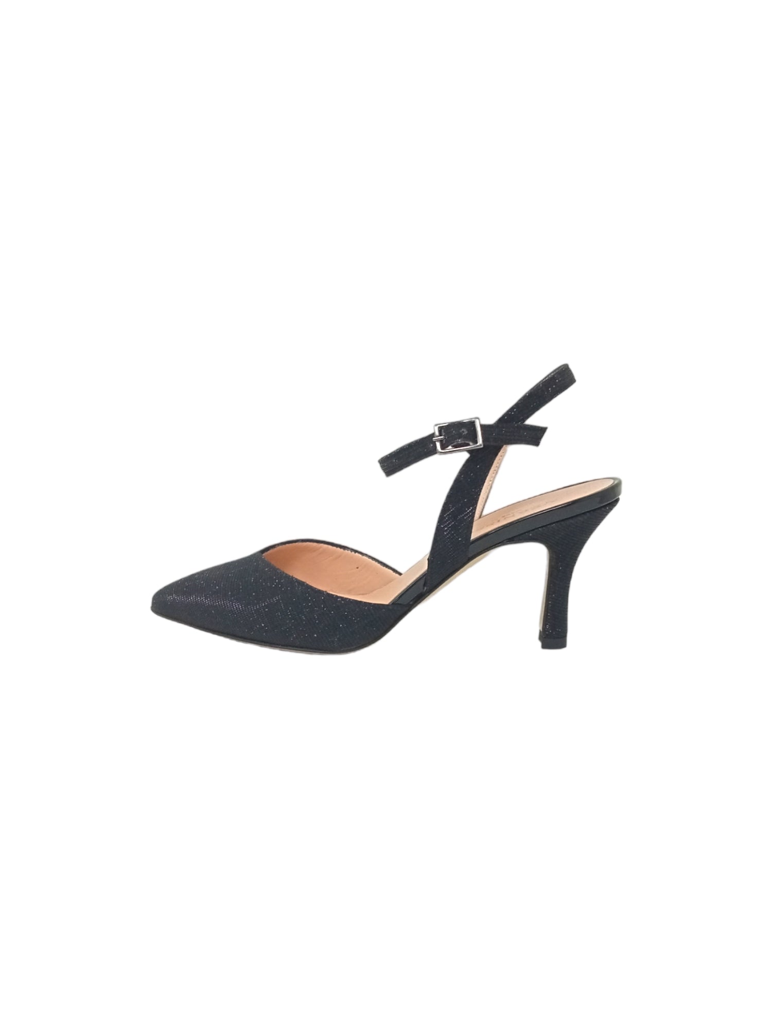 Questo dècolletè è realizzato da un materiale esterno in pelle e tessuto glitterato sulla punta, un materiale interno in pelle ed una chiusura con cinturino regolabile alla caviglia, la suola è in vero cuoio, il tacco è alto circa 4 cm